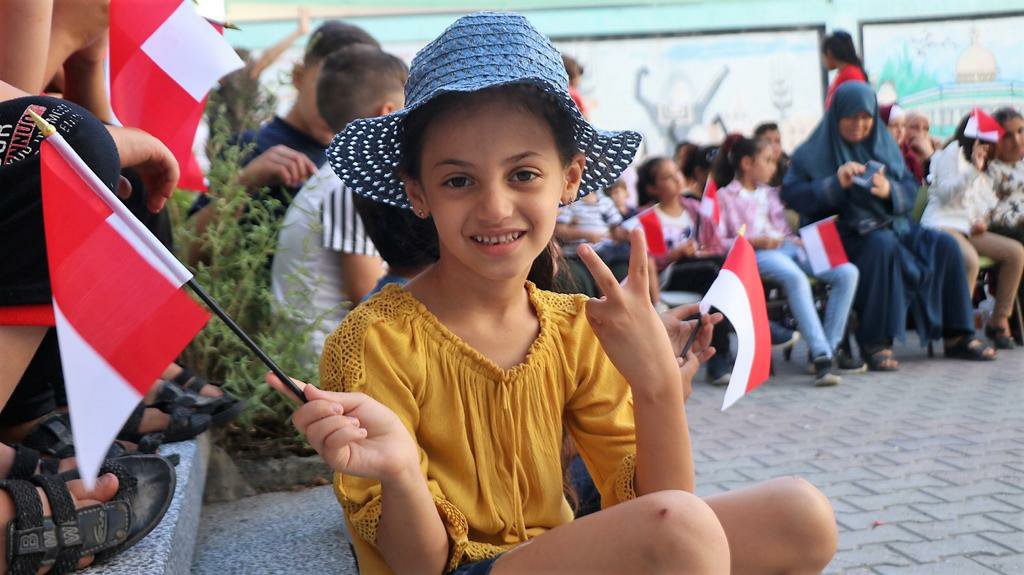 Anak-anak Palestina bersama relawan LazisMu sedang bersuka ria dengan membawa bendera Indonesia usai pelaksanaan upacara bendera peringatan hari kemerdekaan RI 76 tahun bagi relawan kemanusiaan dari LazisMu di Palestina.
