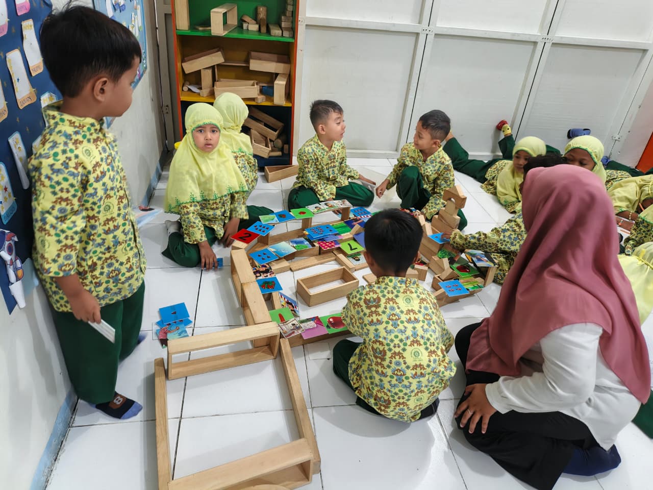 Menggunakan media yang terbuat dari kayu dengan berbagai ukuran dan bentuk, siswa mulai menyusun bangunan rumah untuk kura–kura. Tak sekadar menyusun bangunan berbentuk kotak persegi, siswa juga mendapat stimulasi untuk bisa bercerita tentang bagian rumah.