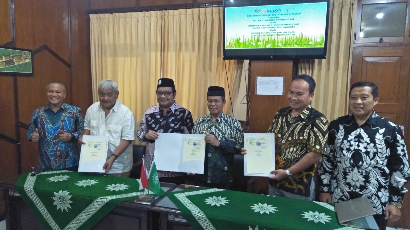 Yogyakarta, CM – Pimpinan Wilayah Muhammadiyah Daerah Istimewa Yogyakarta (PWM DIY) menggandeng Perum Kanwil Bulog DIY dan PT Kaltim Bumi Energi Etam dalam rangka awal pemenuhan kebutuhan dan ketahanan pangan khususnya untuk warga Muhammadiyah. Kolaborasi membangun ketahanan pangan ini secara simbolik dilakukan melalui Penandatanganan MOU tripartait antara Pimpinan Wilayah Muhammadiyah DIY dengan Perum Kanwil Bulog DIY dan PT Kaltim Bumi Energi Etam di Gedung PWM DIY Jl Gedong kuning Yogyakarta pada Kamis (7/9/23). Penandatanganan MOU untuk kali pertama di Muhammadiyah DIY dengan Perum Bulog ini dilakukan oleh Ketua PWM DIY DR. HM Ikhwan Ahada, M. Ag., sekretaris H. Arief Jamali Muis, M.Pd , Pimpinan Wilayah Perum Bulog Wilayah DIY Ali Ahmad Najih Amsari dan direktur Utama PT KBEE Herey Husodo. Kerjasama ini direncanakan akan dimulai dengan dibangun 50 tokoMu baru dengan konsep modern dan mengedepankan produk halal dan kemanfaatkan serta pembangunan Distribution centre (DC) sebagai penopang bisnis.