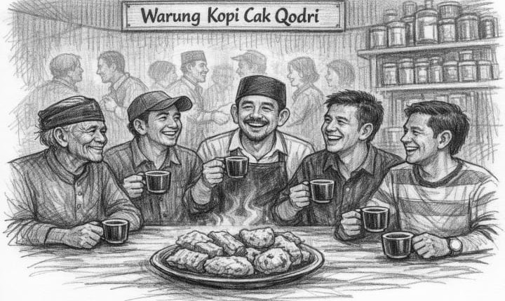 Srengenge wis dhuwur, katon menthor-menthor, ing dina katelu wulan Syawal 1447 Hijriyah. Warung kopine cak Qodri wis bukak lan gorengan tahu, tempe, ote-ote uga jajanan liyane ya wis jangkep. Budi wis mapan lan nyruput kopi pahit, sinambi ngemil tempe goreng anget.