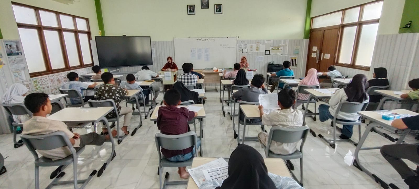 Dan, pada Senin – Kamis (6-9/4/2026) ini dilaksanakan tes tulis dengan mata ujian yang diampu murid di kelas VI. Berbeda dengan asesmen sebelumnya, di PSAJ ini pengawas ruang terdiri atas dua guru dari jenjang yang berbeda. Untuk meningkatkan konsentrasi dan kecermatan siswa, satu lantai hanya diperuntukkan buat kegiatan ini. Disiapkan dua ruang asesmen, 1 ruang pengawas/ sekretariat dan 1 ruang transit untuk siswa kelas VI. Sedangkan siswa kelas I-V libur secara bergantian.