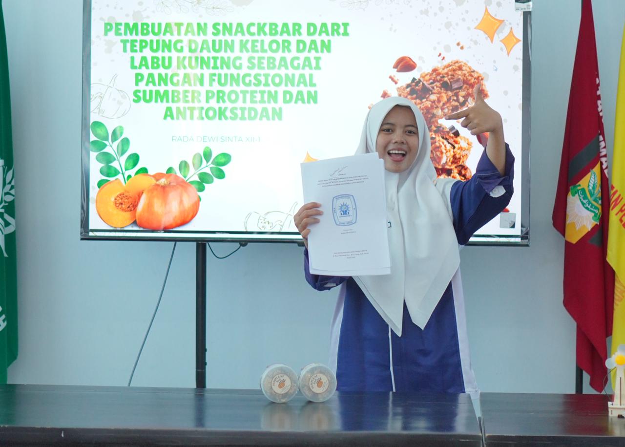 GIRIMU.COM — Rada Dewi Sinta, salah satu siswa SMA Muhammadiyah 8 (SMAMDELA) Gresik berhasil menciptakan produk pangan yang inspiratif dan membanggakan. Siswa kelas XII ini sukses menciptakan produk pangan berupa camilan (snack) bergizi tinggi, berbahan baku tepung daun kelor.