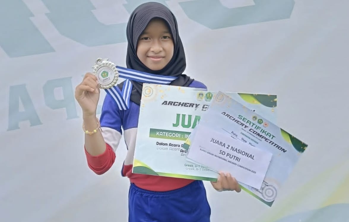 GIRIMU.COM — Almira Mutia Maritza Altaf, siswa kelas VI SD Alam Muhammadiyah Kedanyang (SD Almadany) Kebomas, Gresik berhasil meraih prestasi membanggakan pada kejuaraan Bupati Gresik Invitational Archery Competition 2025 yang diselenggarakan Persatuan Panahan Indonesia (Perpani) Gresik. Dalam lomba panahan yang berlangsung di Lapangan Sarana Olah Raga (SOR) Timur Petrokimia Gresik Sabtu – Ahad (6-7/12/2025) itu, Almira berhasil menjadi juara II.