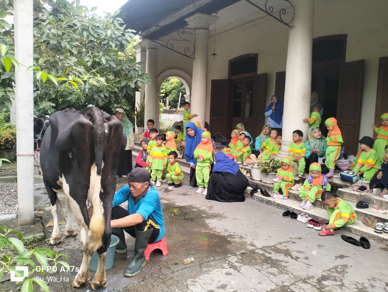 Anak-anak sangat antusias ketika melihat langsung sapi yg didampingi oleh petugas peternakan. Setelah mengamati langsung binatang sapi, kegiatan dilanjutkan dengan kegiatan memerah susu sapi yang dikerjakan oleh petugas.