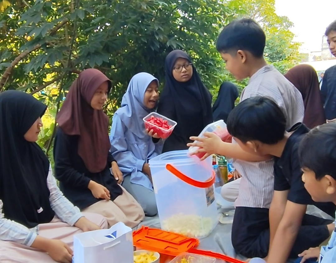 Siswa laki-laki tampak sigap menata terpal, sementara siswa perempuan cekatan menyiapkan bahan. Potongan semangka, melon, nanas, apel, kiwi, alpukat, dan pepaya memenuhi baskom besar. Ditambah nata de coco dan biji selasih, racikan es buah itu semakin lengkap.