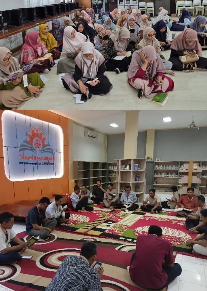 GIRIMU.COM — Untuk menguatkan nilai-nilai spiritual dan membangun budaya Qurani di lingkungan sekolah, ustadz dan ustadzah serta seluruh karyawan SMP Muhammadiyah 12 GKB (Spemdalas) Gresik melaksanakan kegiatan Tadarus Al-Quran selama bulan Ramadan, mulai Jumat (20/2/2026). Kegiatan tadarus ini dilaksanakan setiap hari Senin hingga Jumat, pukul 13.10–13.40 WIB, setelah kultum Ramadan.
