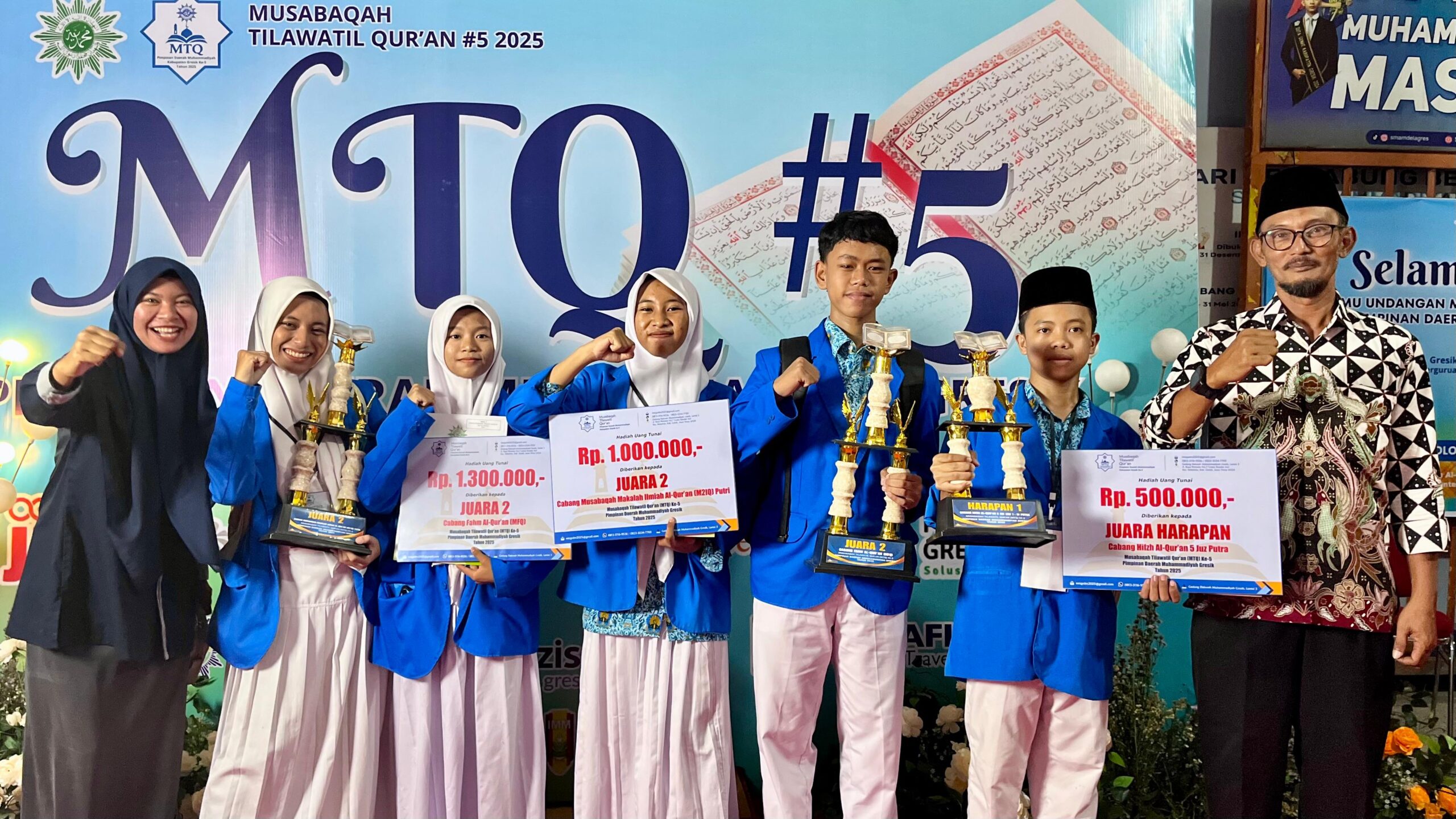 GIRIMU.COM – SMA Muhamamdiyah 5 (Smala) Dukun, Gresik berhasil menyabet tiga prestasi dari tiga cabang lomba berbeda dalam Musabaqah Tilawatil Qur’an (MTQ) V di Perguruan Muhammadiyah Cerme, Sabtu-Ahad (11-12/10/2025). Ketiga prestasi tersebut, yakni juara II oleh Nayla Shafira (XII-1) dalam cabang Makalah Ilmiah Al-Qur’an, juara harapan oleh Mohammad Wildan Firdaus (X-2) dalam cabang Hifdz Al-Qur’an kategori 5 juz, dan juara 2 cabang Fahm Al-Qur’an beregu oleh Muhammad Naufal Al Habibi (XI-1), Nailah Nahda (XI-2), dan Luri Lestari (X-2).